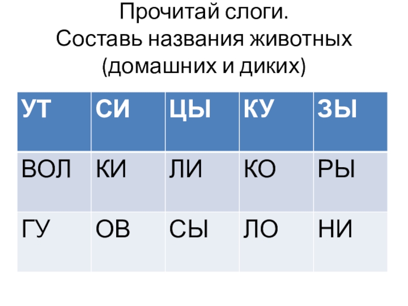 Слайд 2Прочитай слоги. Составь названия животных (домашних и диких)