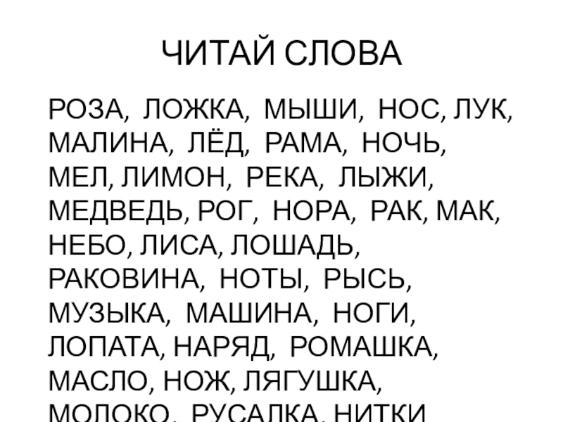 ЧИТАЙ СЛОВАРОЗА, ЛОЖКА, МЫШИ, НОС, ЛУК, МАЛИНА, ЛЁД, РАМА, НОЧЬ, МЕЛ, ЛИМОН, РЕКА, ЛЫЖИ, МЕДВЕДЬ, РОГ, НОРА,