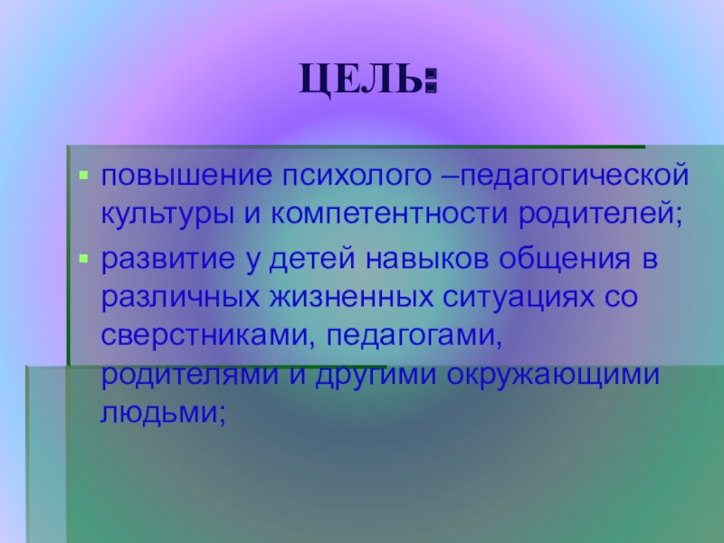 ЦЕЛЬ:повышение психолого –педагогической культуры и компетентности родителей;развитие у детей навыков общения в различных жизненных ситуациях со сверстниками,