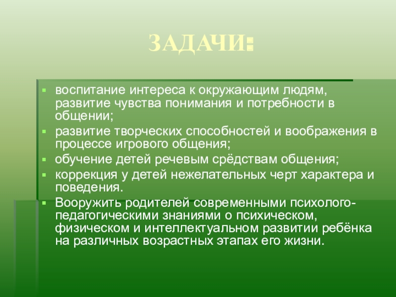 Вооружить родителей современными психолого-педагогическими знаниями о психическом, физическом и интеллектуальном развитии ребёнка на различных возрастных этапах его жизни.