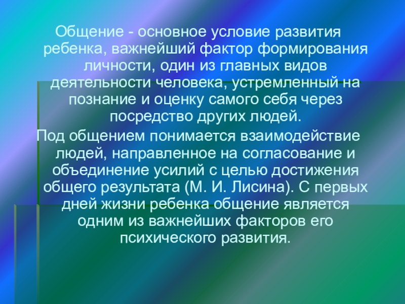 Под общением понимается взаимодействие людей, направленное на согласование и объединение усилий с целью достижения общего результата (М. И. Лисина). С первых дней жизни ребенка общение является одним из важнейших факторов его психического развития.