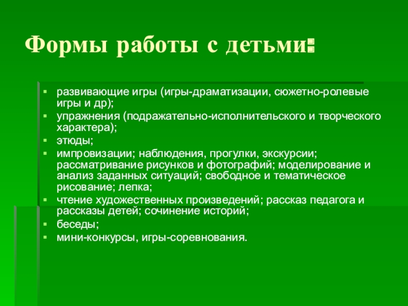 Формы работы с детьми:развивающие игры (игры-драматизации, сюжетно-ролевые игры и др);упражнения (подражательно-исполнительского и творческого характера);этюды;импровизации; наблюдения, прогулки, экскурсии;