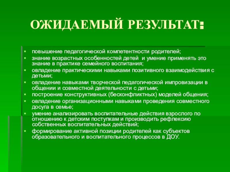 ОЖИДАЕМЫЙ РЕЗУЛЬТАТ:повышение педагогической компетентности родителей; знание возрастных особенностей детей и умение применять это знание в практике семейного