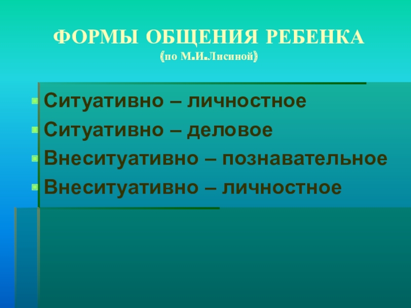ФОРМЫ ОБЩЕНИЯ РЕБЕНКА (по М.И.Лисиной)Ситуативно – личностноеСитуативно – деловоеВнеситуативно – познавательноеВнеситуативно – личностное