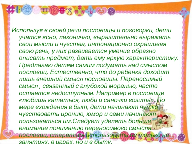 выразительно выражать свои мысли и чувства, интонационно окрашивая свою речь, у них развивается умение образно описать предмет, дать ему яркую характеристику. Предлагаю детям самим подумать над смыслом пословиц. Естественно, что до ребенка доходит лишь внешний смысл пословицы. Переносимый смысл , связанный с глубокой моралью, часто остается недоступным. Например в пословице «любишь кататься, люби и саночки возить». По мере вхождения в быт, дети начинают чутко чувствовать иронию, юмор и сами начинают пользоваться им.Следует уделять больше внимание пониманию переносимого смысла пословиц, стараться использовать не только на занятиях, в играх, но и в быту.