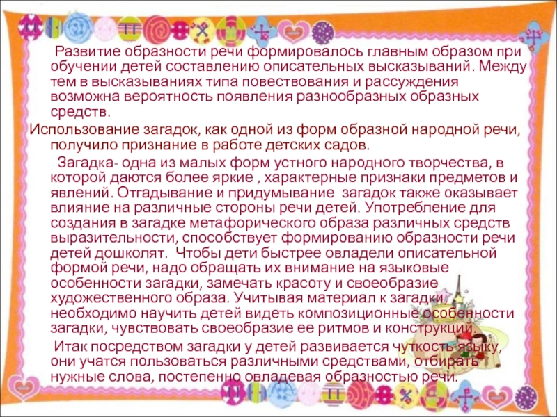 Итак посредством загадки у детей развивается чуткость языку, они учатся пользоваться различными средствами, отбирать нужные слова, постепенно овладевая образностью речи.