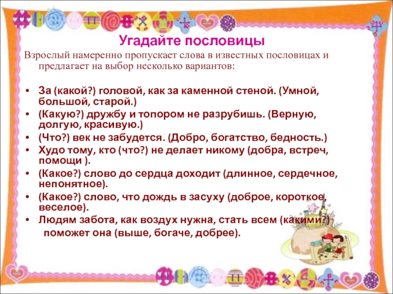 Взрослый намеренно пропускает слова в известных пословицах и предлагает на
