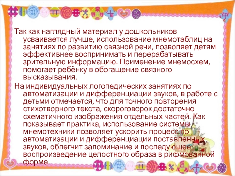 занятиях по развитию связной речи, позволяет детям эффективнее воспринимать и перерабатывать зрительную информацию. Применение мнемосхем, помогает ребёнку в обогащение связного высказывания.