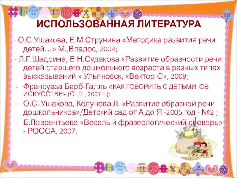 Е.Н.Судакова «Развитие образности речи детей старшего дошкольного возраста в разных типах высказываний » Ульяновск, «Вектор-С», 2009;