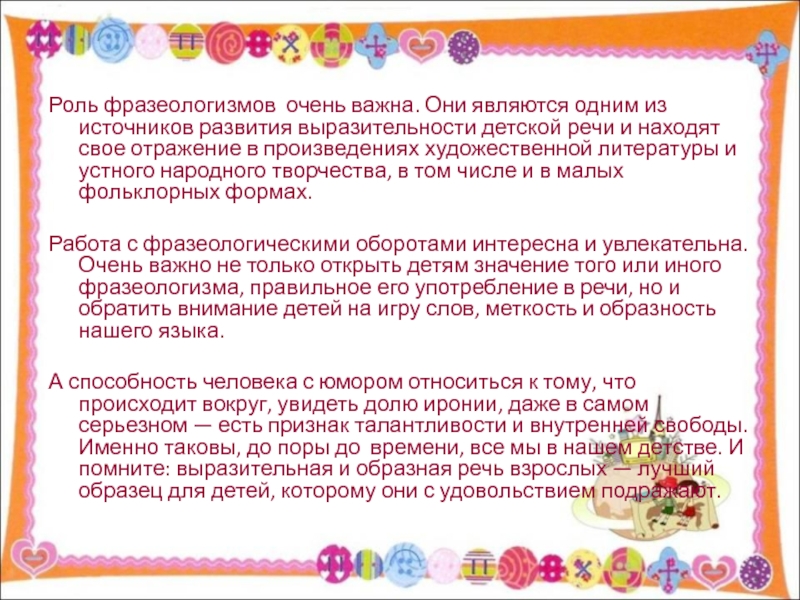 Слайд 14Роль фразеологизмов очень важна. Они являются одним из источников развития выразительности