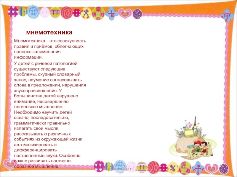 У детей с речевой патологией существуют следующие проблемы: скудный словарный запас, неумение согласовывать слова в предложении, нарушения звукопроизношения. У большинства детей нарушено внимание, несовершенно логическое мышление. Необходимо научить детей связно, последовательно, грамматически правильно излагать свои мысли, рассказывать о различных событиях из окружающей жизни автоматизировать и дифференцировать поставленные звуки. Особенно важно развивать наглядно-образное мышление.