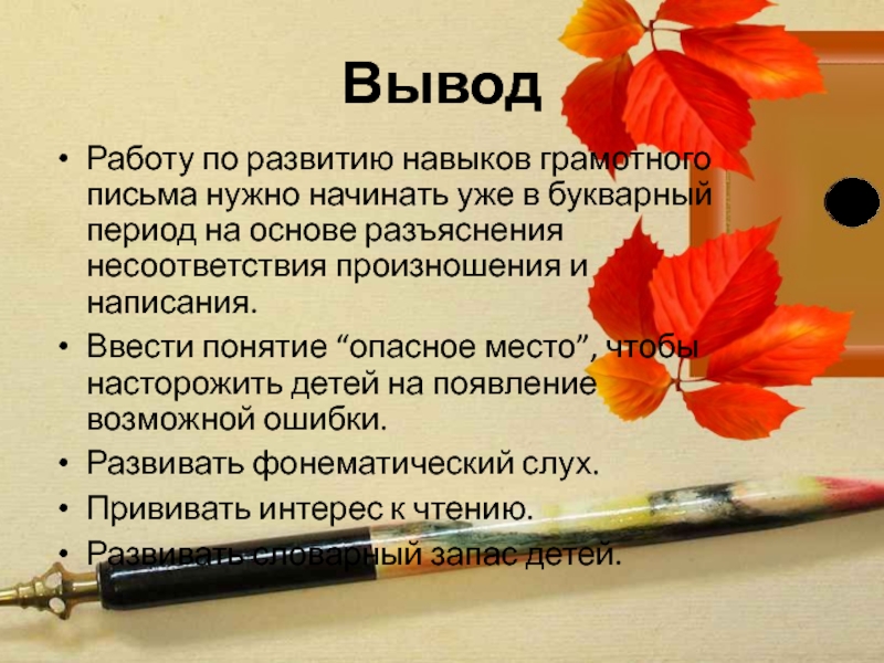 Работу по развитию навыков грамотного письма нужно начинать уже в букварный