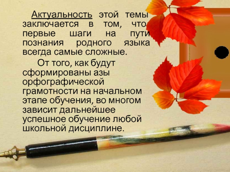 От того, как будут сформированы азы орфографической грамотности на начальном этапе обучения, во многом зависит дальнейшее успешное обучение любой школьной дисциплине.