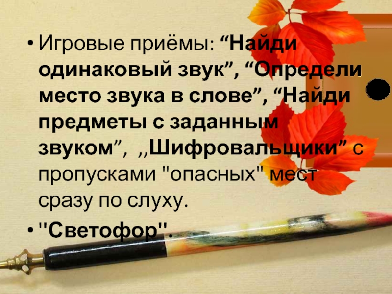 Слайд 15Игровые приёмы: “Найди одинаковый звук”, “Определи место звука в слове”, “Найди