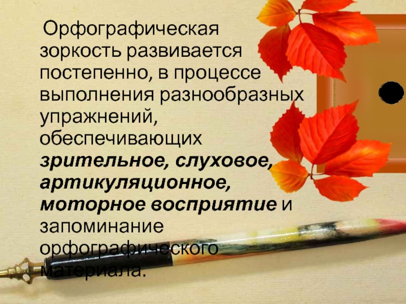 Слайд 5 Орфографическая зоркость развивается постепенно, в процессе выполнения разнообразных упражнений,