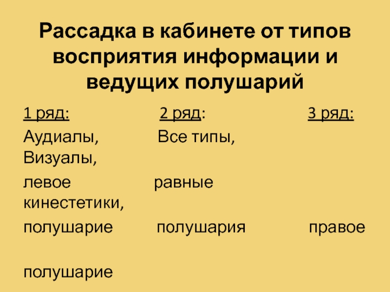 Слайд 12Рассадка в кабинете от типов восприятия информации и ведущих полушарий
