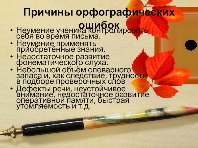 Небольшой объём словарного запаса и, как следствие, трудности в подборе проверочных слов
