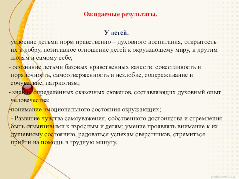 – духовного воспитания, открытость их к добру, позитивное отношение детей к окружающему миру, к другим людям и самому себе;