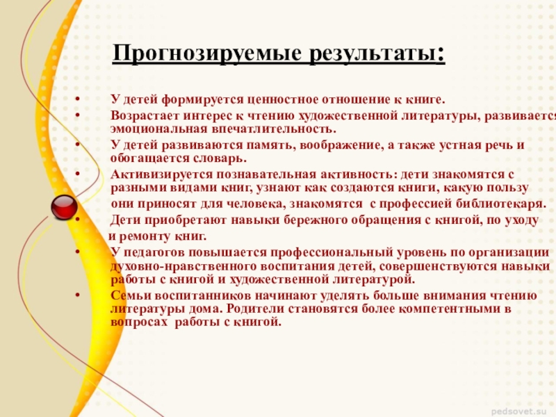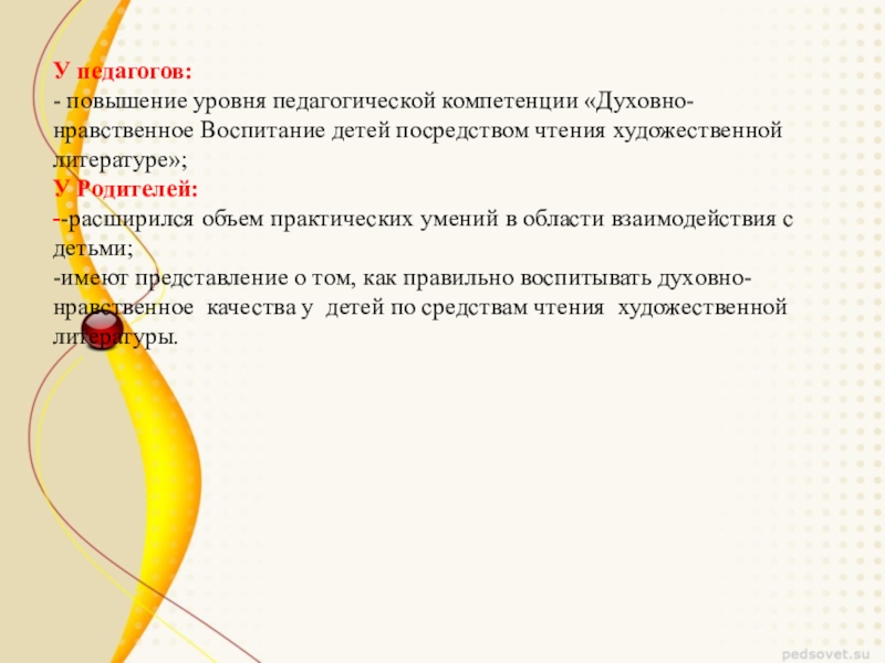 У педагогов повышается профессиональный уровень по организации духовно-нравственного воспитания детей, совершенствуются навыки работы с книгой и художественной литературой.
