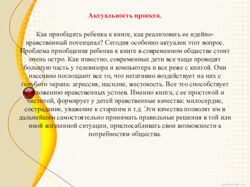 потенциал? Сегодня особенно актуален этот вопрос. Проблема приобщения ребенка к книге в современном обществе стоит очень остро. Как известно, современные дети все чаще проводят большую часть у телевизора и компьютера и все реже с книгой. Они пассивно поглощают все то, что негативно воздействует на них с голубого экрана: агрессия, насилие, жестокость. Все это способствует разложению нравственных устоев. Именно книга, с ее простотой и чистотой, формирует у детей нравственные качества: милосердие, сострадание, уважение к старшим и т.д. Эти качества позволят им в дальнейшем самостоятельно принимать правильные решения в той или иной жизненной ситуации, приспосабливать свои возможности к потребностям общества.