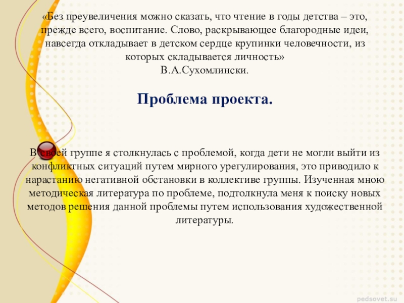 В своей группе я столкнулась с проблемой, когда дети не могли выйти из конфликтных ситуаций путем мирного урегулирования, это приводило к нарастанию негативной обстановки в коллективе группы. Изученная мною методическая литература по проблеме, подтолкнула меня к поиску новых методов решения данной проблемы путем использования художественной литературы.