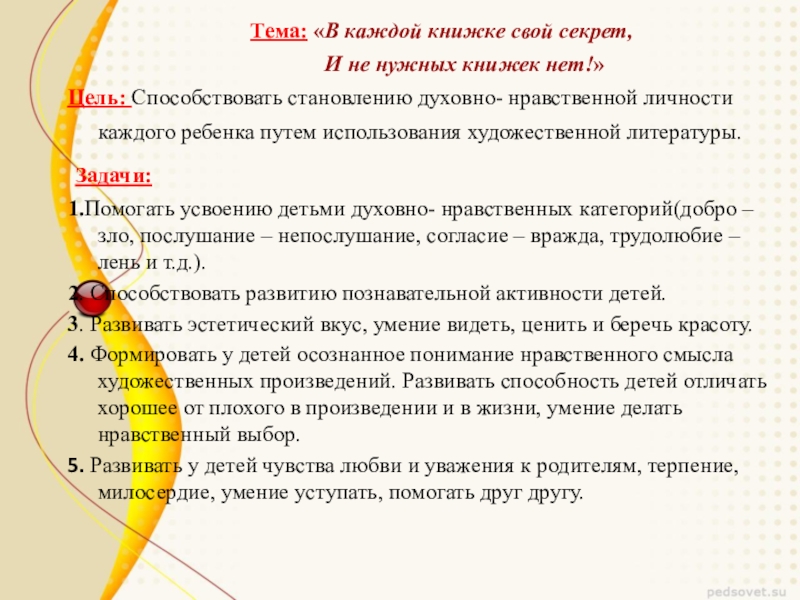 Цель: Способствовать становлению духовно- нравственной личности каждого ребенка путем использования художественной литературы.