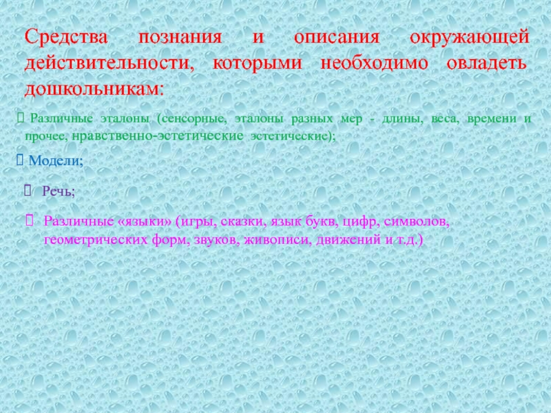 Различные «языки» (игры, сказки, язык букв, цифр, символов, геометрических форм, звуков, живописи, движений и т.д.)