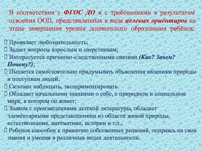 Знаком с произведениями детской литературы, обладает элементарными представлениями из области живой природы, естествознания, математики, истории и т.п.;
