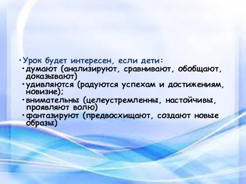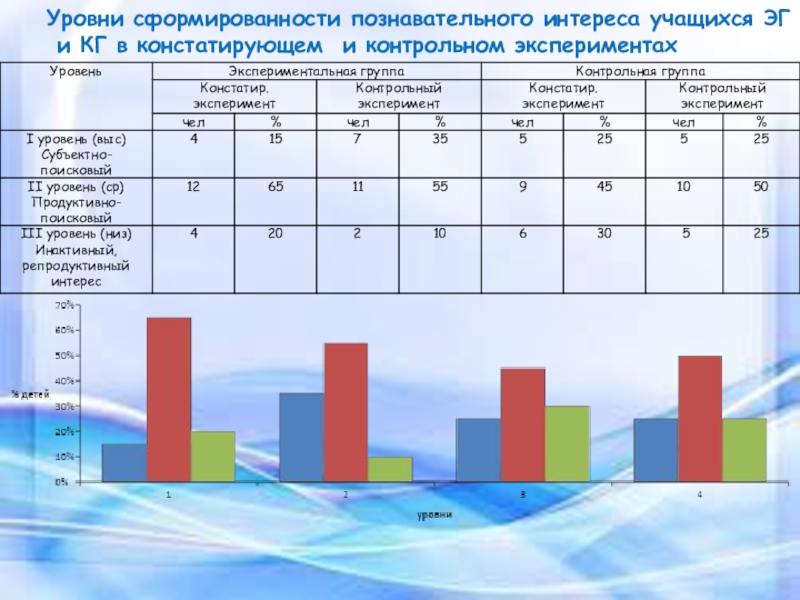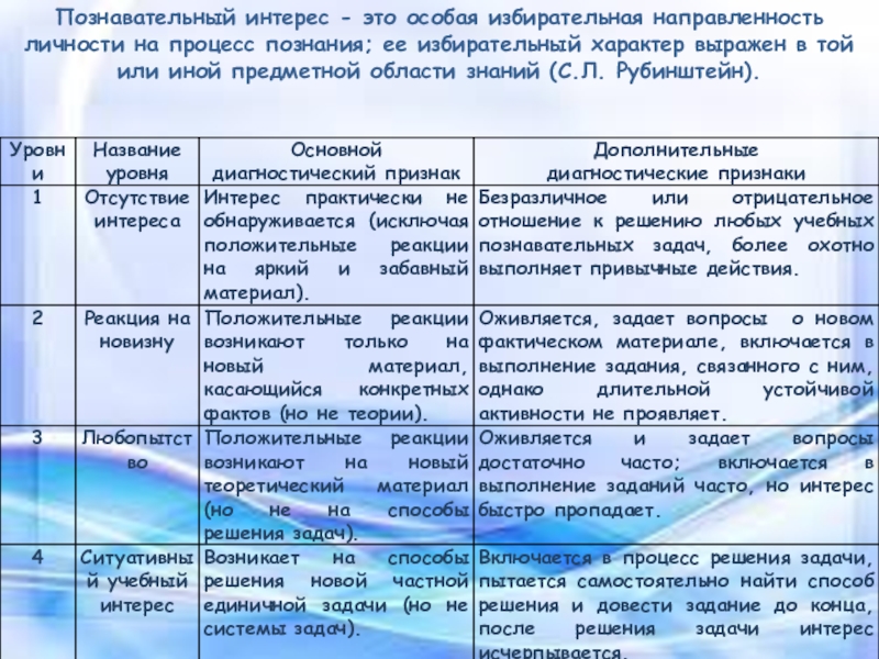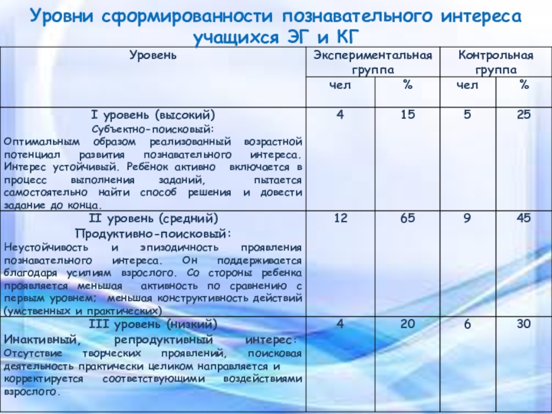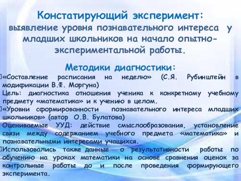 1. Провести констатирующий эксперимент: выявить уровень познавательного интереса у младших школьников на момент до проведения эксперимента.
