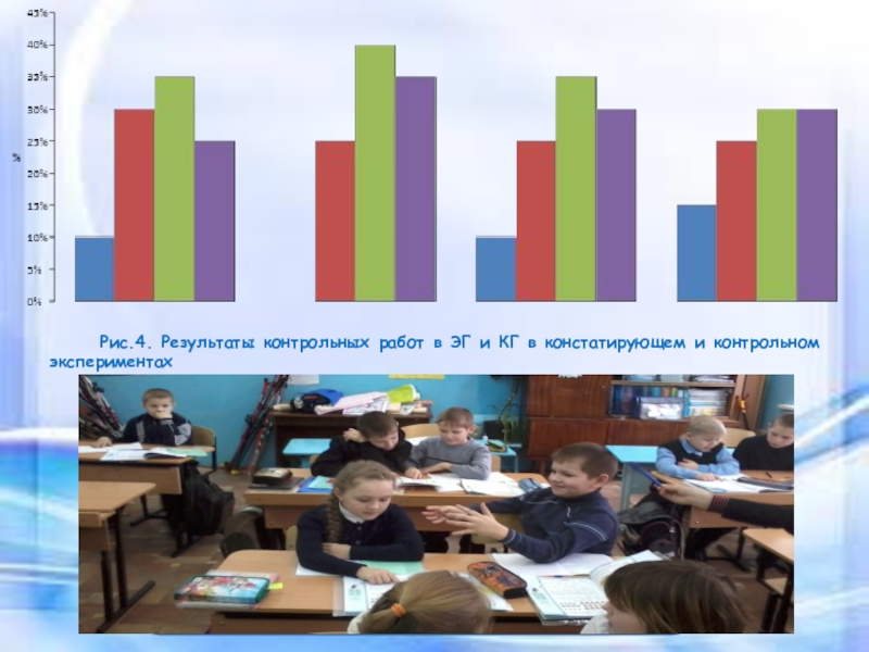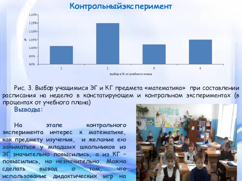 Рис. 3. Выбор учащимися ЭГ и КГ предмета «математика» при составлении расписания на неделю в констатирующем и контрольном экспериментах (в процентах от учебного плана)