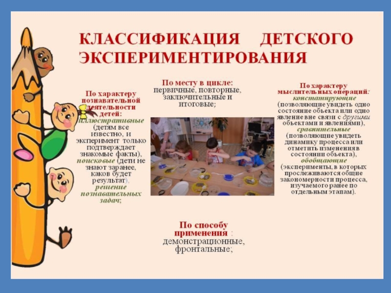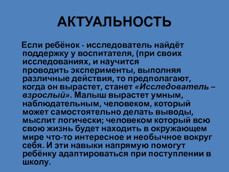 исследованиях, и научится проводить эксперименты, выполняя различные действия, то предполагают, когда он вырастет, станет «Исследователь – взрослый». Малыш вырастет умным, наблюдательным, человеком, который может самостоятельно делать выводы, мыслит логически; человеком который всю свою жизнь будет находить в окружающем мире что-то интересное и необычное вокруг себя. И эти навыки напрямую помогут ребёнку адаптироваться при поступлении в школу.