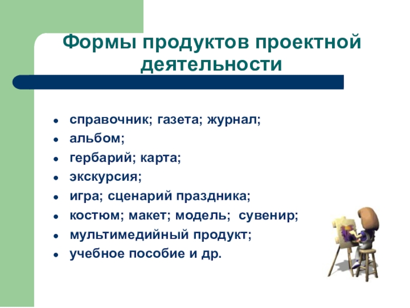 Творческий проект предполагает максимально свободный авторский подход в решении проблемы. Продукт – альманахи, совместная газета и сочинение, театрализация, произведения изобразительного или декоративно-прикладного искусства.