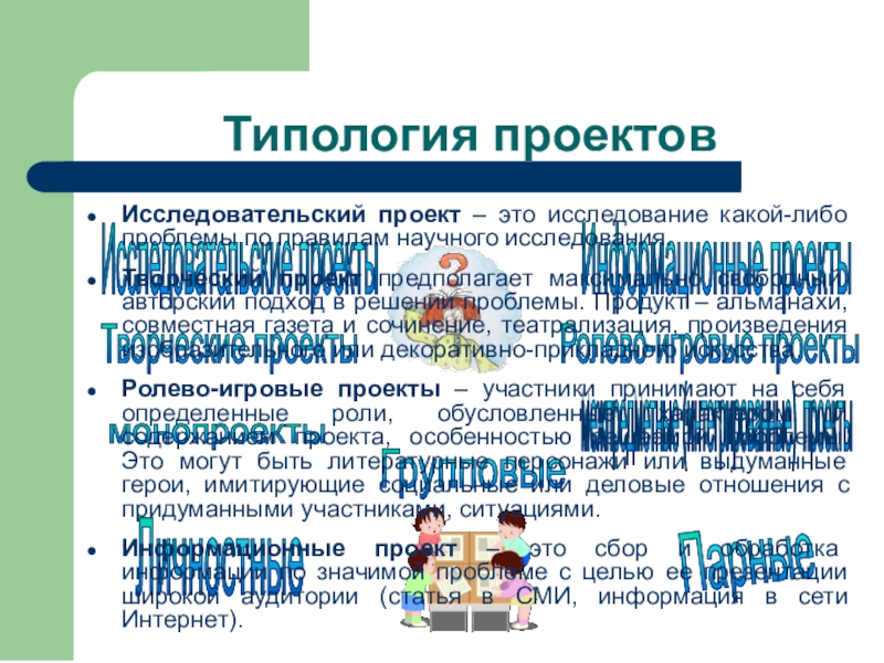 Ролево-игровые проекты – участники принимают на себя определенные роли, обусловленные характером и содержанием проекта, особенностью решаемой проблемы. Это могут быть литературные персонажи или выдуманные герои, имитирующие социальные или деловые отношения с придуманными участниками, ситуациями.