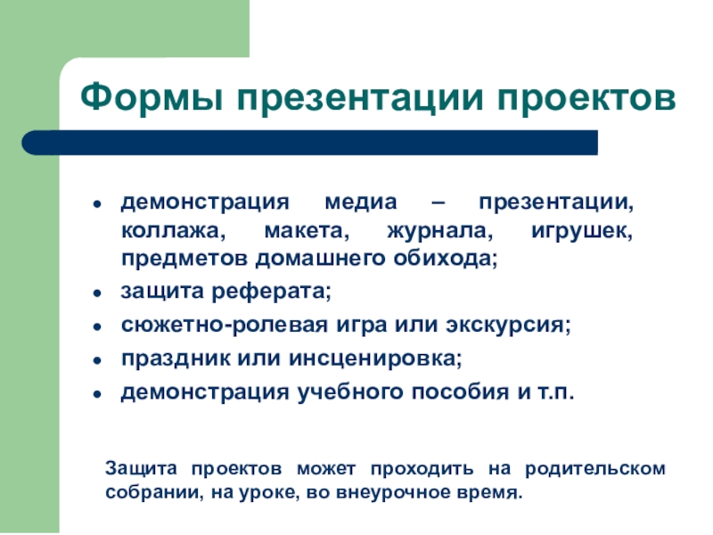 Защита проектов может проходить на родительском собрании, на уроке, во внеурочное время.
