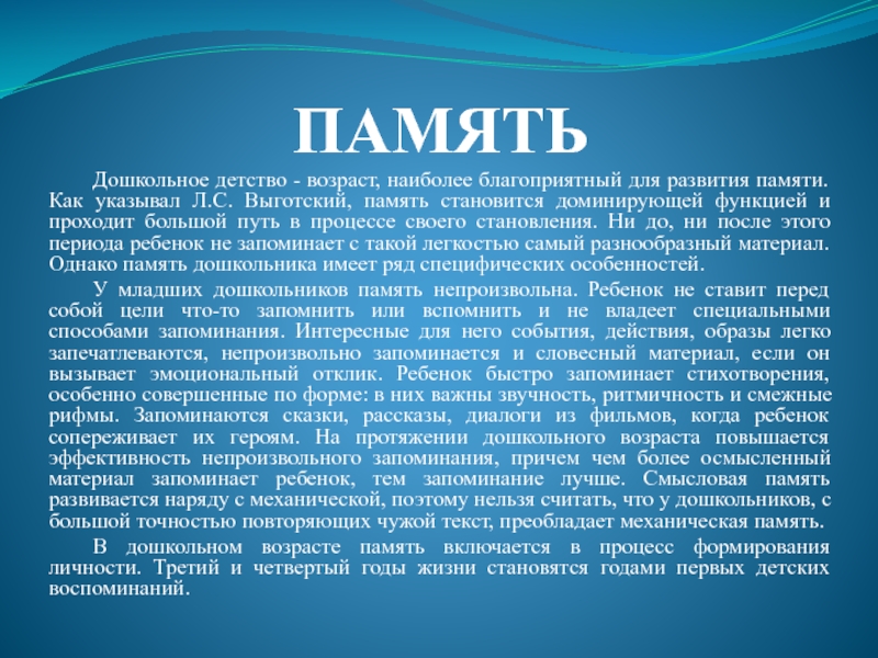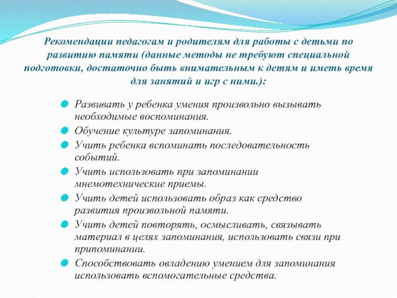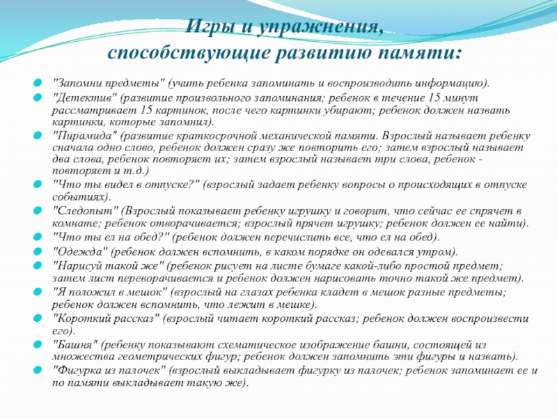 Развивать у ребенка умения произвольно вызывать необходимые воспоминания.
