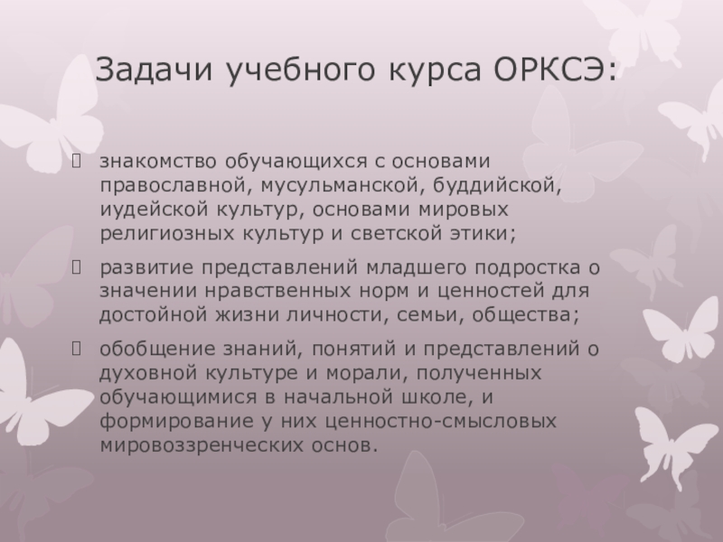 Цель учебного курса ОРКСЭ – формирование у младшего подростка мотиваций к осознанному нравственному поведению, основанному на знании и уважении культурных и религиозных традиций многонационального народа России, а также к диалогу с представителями других культур и мировоззрений.