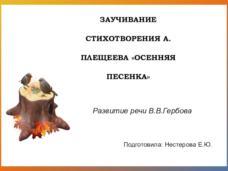 ЗАУЧИВАНИЕ СТИХОТВОРЕНИЯ А. ПЛЕЩЕЕВА «ОСЕННЯЯ ПЕСЕНКА»Развитие речи В.В.ГербоваПодготовила: Нестерова Е.Ю.