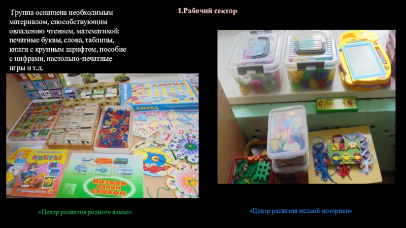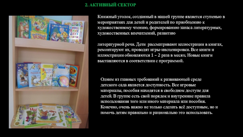 Одним из главных требований к развивающей среде детского сада является доступность. Все игровые материалы, пособия находятся в свободном доступе для детей. В группе есть свой порядок и внутренние правила использования того или иного материала или пособия. Конечно, очень важно не только сделать всё доступным, но и помочь детям правильно и рационально это использовать.