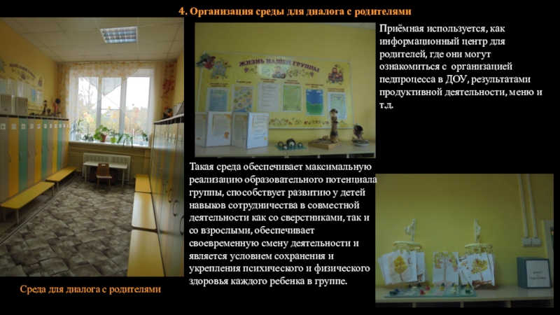 Приёмная используется, как информационный центр для родителей, где они могут ознакомиться с организацией педпроцесса в ДОУ, результатами продуктивной деятельности, меню и т.д.