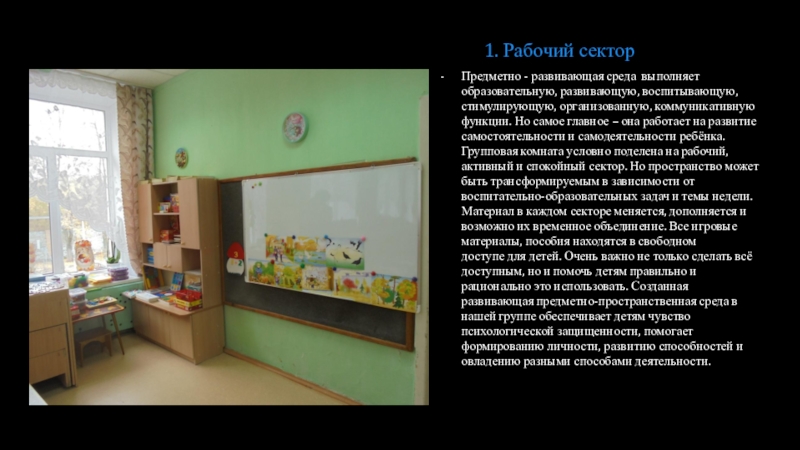 Такая среда обеспечивает максимальную реализацию образовательного потенциала группы, способствует развитию у детей навыков сотрудничества в совместной деятельности как со сверстниками, так и со взрослыми, обеспечивает своевременную смену деятельности и является условием сохранения и укрепления психического и физического здоровья каждого ребенка в группе.