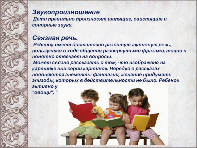 Может связно рассказать о том, что изображено на картинке или серии картинок. Нередко в рассказах появляются элементы фантазии, желание придумать эпизоды, которых в действительности не было. Ребенок активно употребляет обобщающие слова ("одежда", "овощи", "животные" и т.п.).