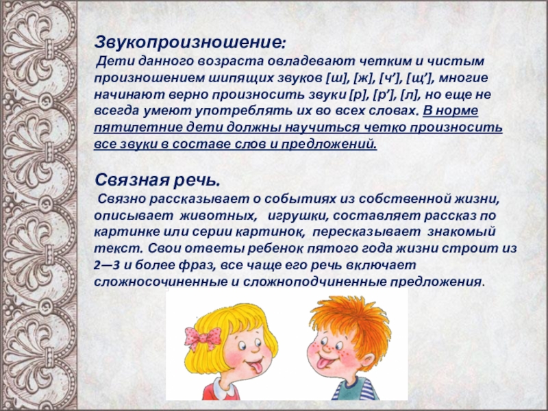[ж], [ч’], [щ’], многие начинают верно произносить звуки [р], [р’], [л], но еще не всегда умеют употреблять их во всех словах. В норме пятилетние дети должны научиться четко произносить все звуки в составе слов и предложений.