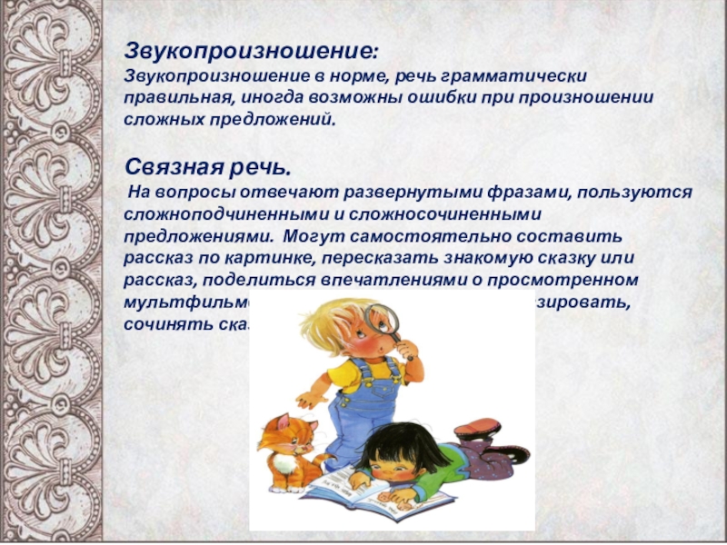 На вопросы отвечают развернутыми фразами, пользуются сложноподчиненными и сложносочиненными предложениями. Могут самостоятельно составить рассказ по картинке, пересказать знакомую сказку или рассказ, поделиться впечатлениями о просмотренном мультфильме, книге. Ребенок может фантазировать, сочинять сказки.