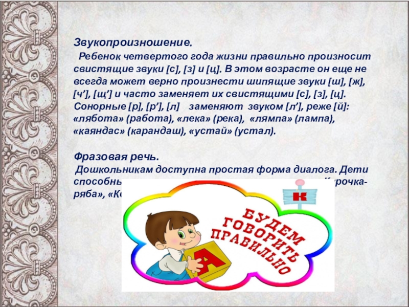 [ц]. В этом возрасте он еще не всегда может верно произнести шипящие звуки [ш], [ж], [ч’], [щ’] и часто заменяет их свистящими [с], [з], [ц]. Сонорные [р], [р’], [л] заменяют звуком [л’], реже [й]: «лябота» (работа), «лека» (река), «лямпа» (лампа), «каяндас» (карандаш), «устай» (устал).