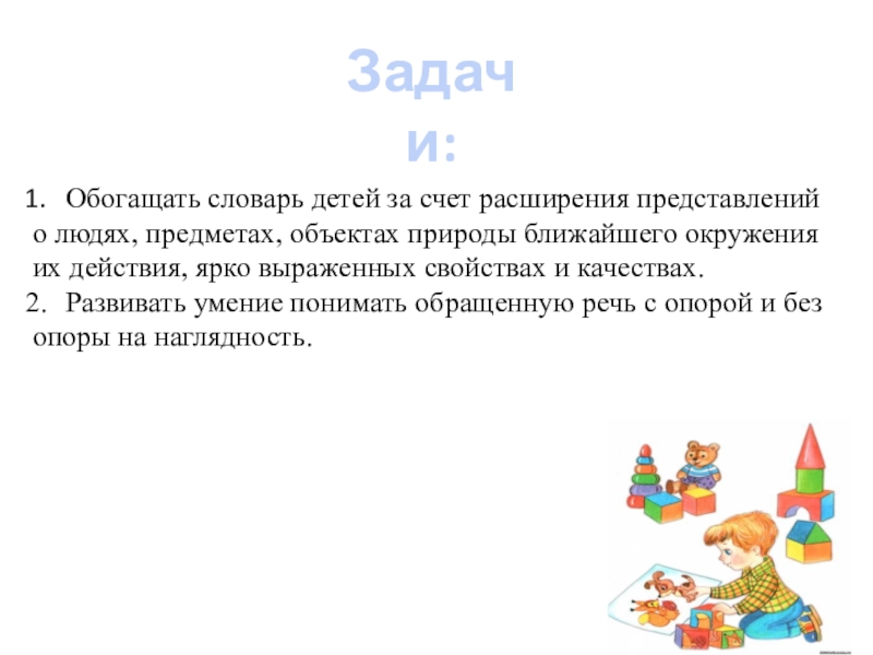 Обогащать словарь детей за счет расширения представленийо людях, предметах, объектах природы ближайшего окруженияих действия, ярко выраженных свойствах