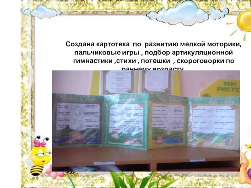 Слайд 15Создана картотека по развитию мелкой моторики, пальчиковые игры , подбор артикуляционной