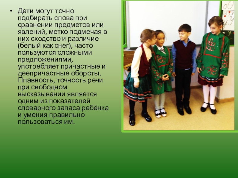 подмечая в них сходство и различие (белый как снег), часто пользуются сложными предложениями, употребляет причастные и деепричастные обороты. Плавность, точность речи при свободном высказывании является одним из показателей словарного запаса ребёнка и умения правильно пользоваться им.