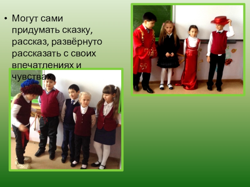 Слайд 9Могут сами придумать сказку, рассказ, развёрнуто рассказать с своих впечатлениях и