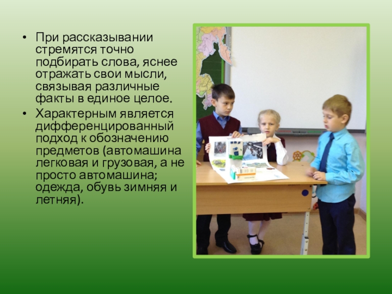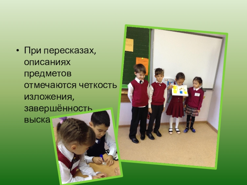 Слайд 7При пересказах, описаниях предметов отмечаются четкость изложения, завершённость высказываний