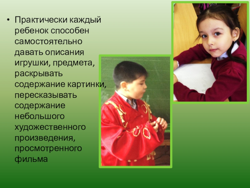 Слайд 8Практически каждый ребенок способен самостоятельно давать описания игрушки, предмета, раскрывать содержание